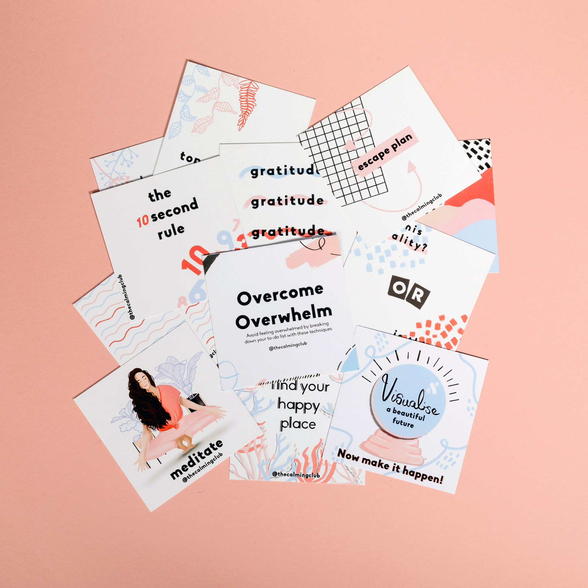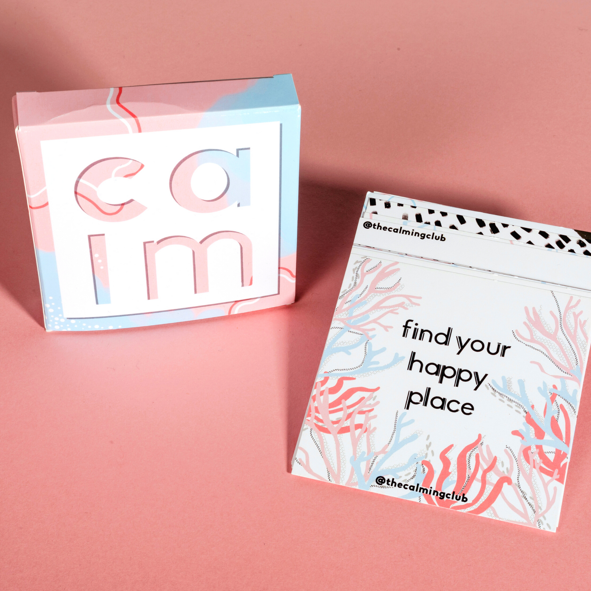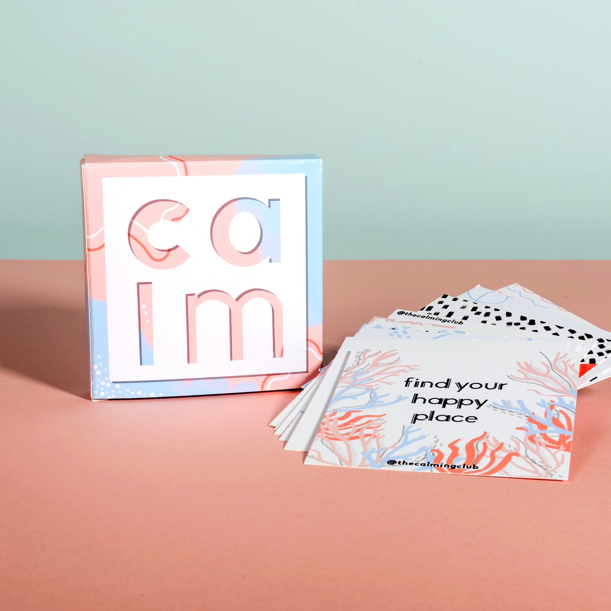 12 Original Calming Cards with practical Anxiety and Stress relief techniques packaged inside a durable pink box.
